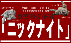 2025.10.25 ホワイトタイガーの「ニックナイト」イベント予約受付開始日のお知らせ ホワイトタイガーの猛獣としての片鱗を感じるイベント「ニックナイト」を開催いたします。11月の火曜日、水曜日、金曜日で1日1組限定開催。予約受付は10月26日(日)17:00より開始いたします。イベントの詳細、ご予約は下記バナーよりお願いいたします。 一覧に戻る