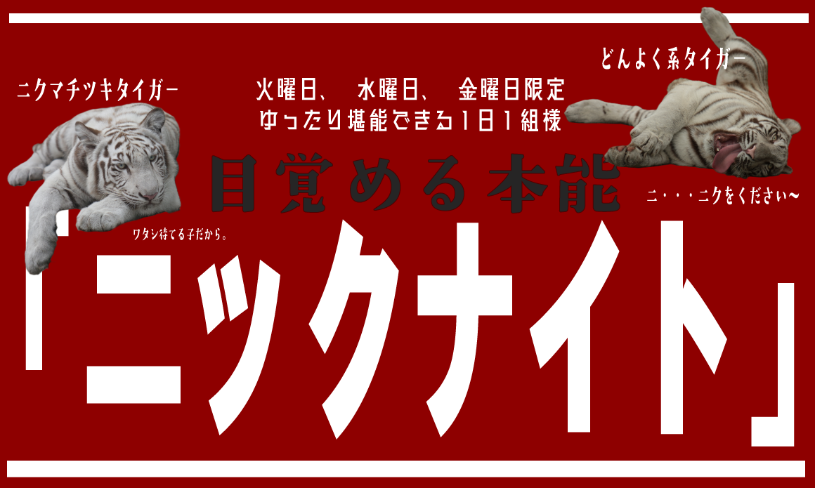 2025.10.25 ホワイトタイガー「ニックナイト」イベント予約受付開始日のお知らせ(完売済み) ホワイトタイガーの猛獣としての一面を間近で感じられる特別イベント「ニックナイト」を開催いたします。 11月の火曜日・水曜日・金曜日に、1日1組限定で実施いたします。 イベントの詳細およびご予約は、下記バナーよりご確認ください。 ※予約受付は10月26日(日)17:00より開始いたしましたが、同日17:00に全日程が完売となりました。 たくさんのお申込み、誠にありがとうございました。 一覧に戻る